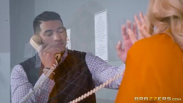A mature blonde bimbo visits her inmate lover in prison. Despite her prison guard uniform, she can't resist his advances. He roughly manhandles her for some illicit fun.